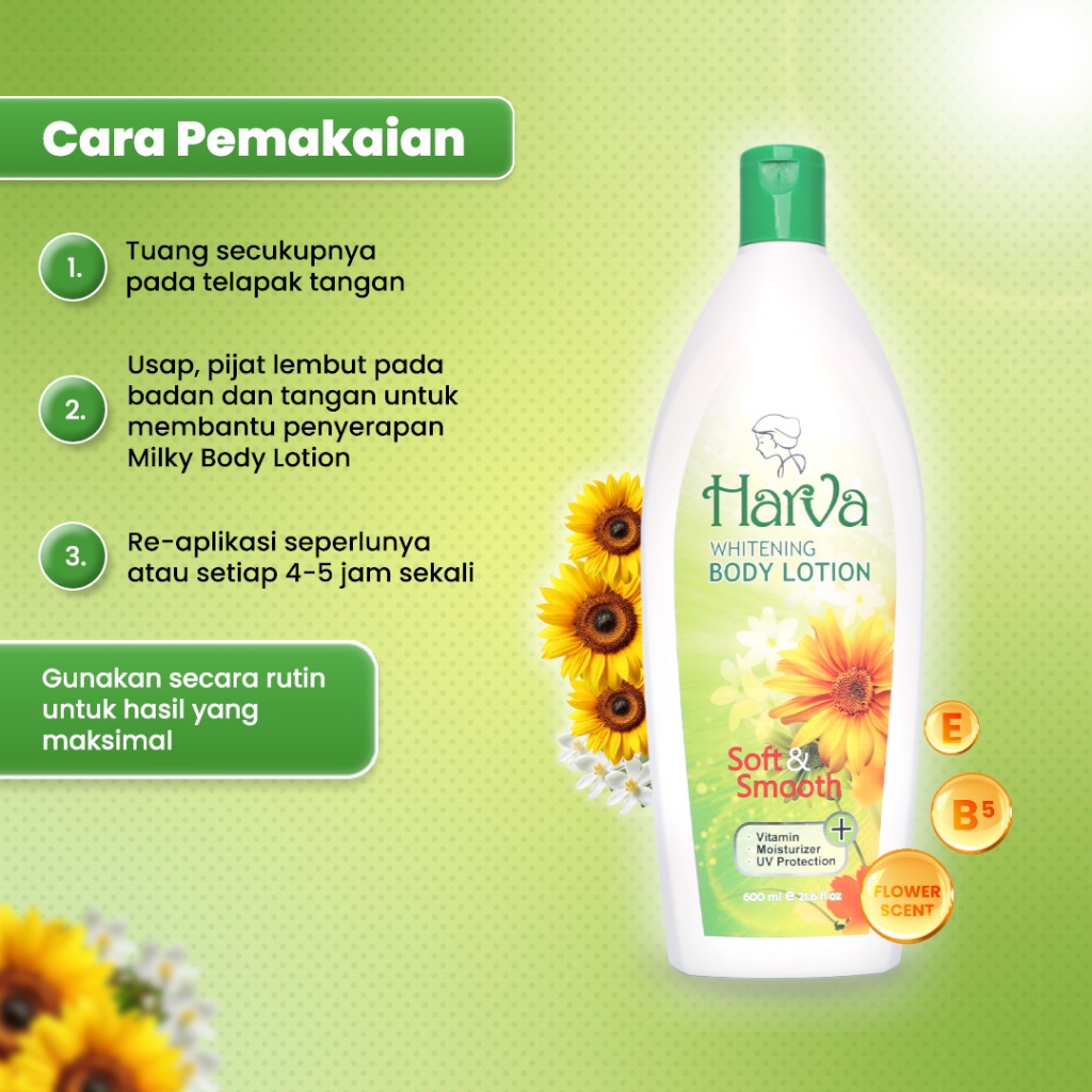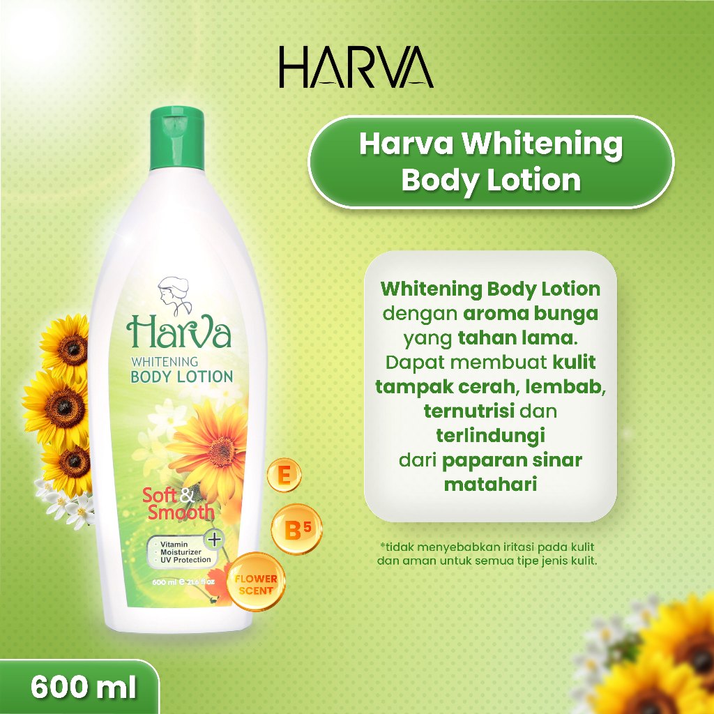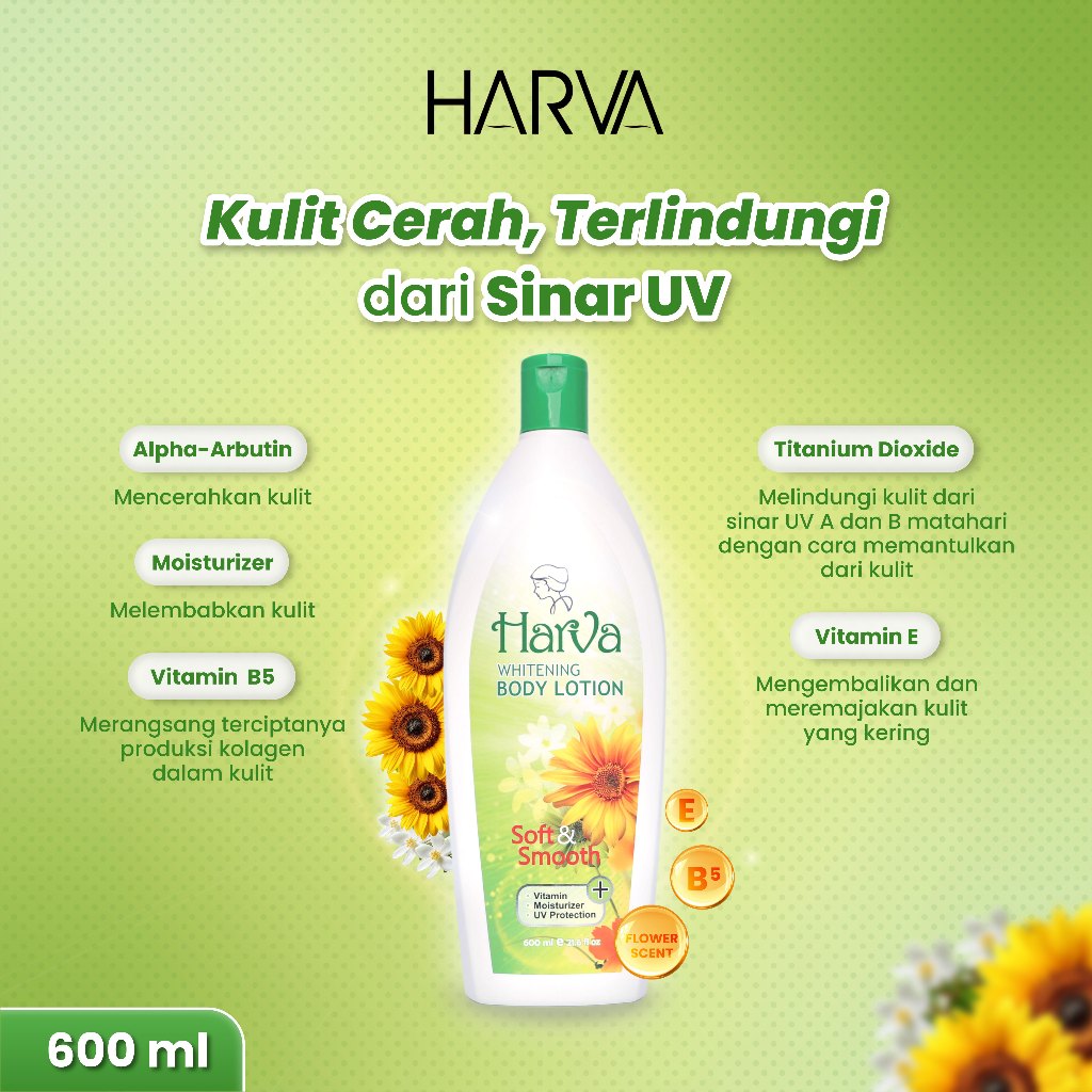 Harva Whitening Body Lotion perawatan kulit dengan aroma dari ekstrak bunga yang dapat memberikan kesegaran sepanjang hari. Lotion ini mengandung Alpha Arbutin yang dapat membuat kulit tampak cerah. Moisturizer yang memberikan kelembaban pada kulit agar tidak mudah kering serta mengandung UV Protection untuk melindungi kulit dari paparan sinar matahari. kandungan Vitamin B5 + Vitamin E memberikan nutrisi pada kulit dan menjaga kulit agar tetap sehat. Tekstur lotion yang lembut dan mudah menyerap di kulit tidak menyebabkan iritasi pada kulit dan aman untuk semua tipe jenis kulit.
