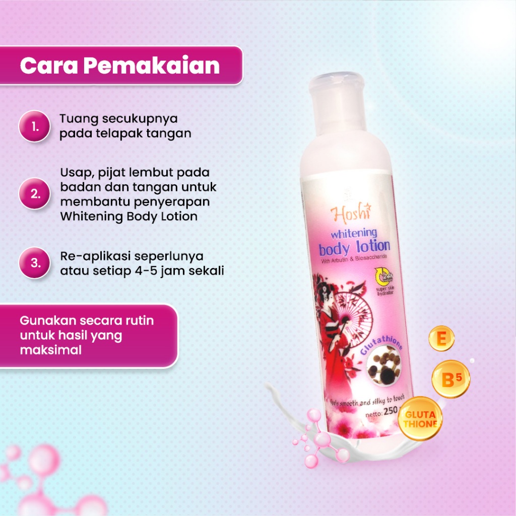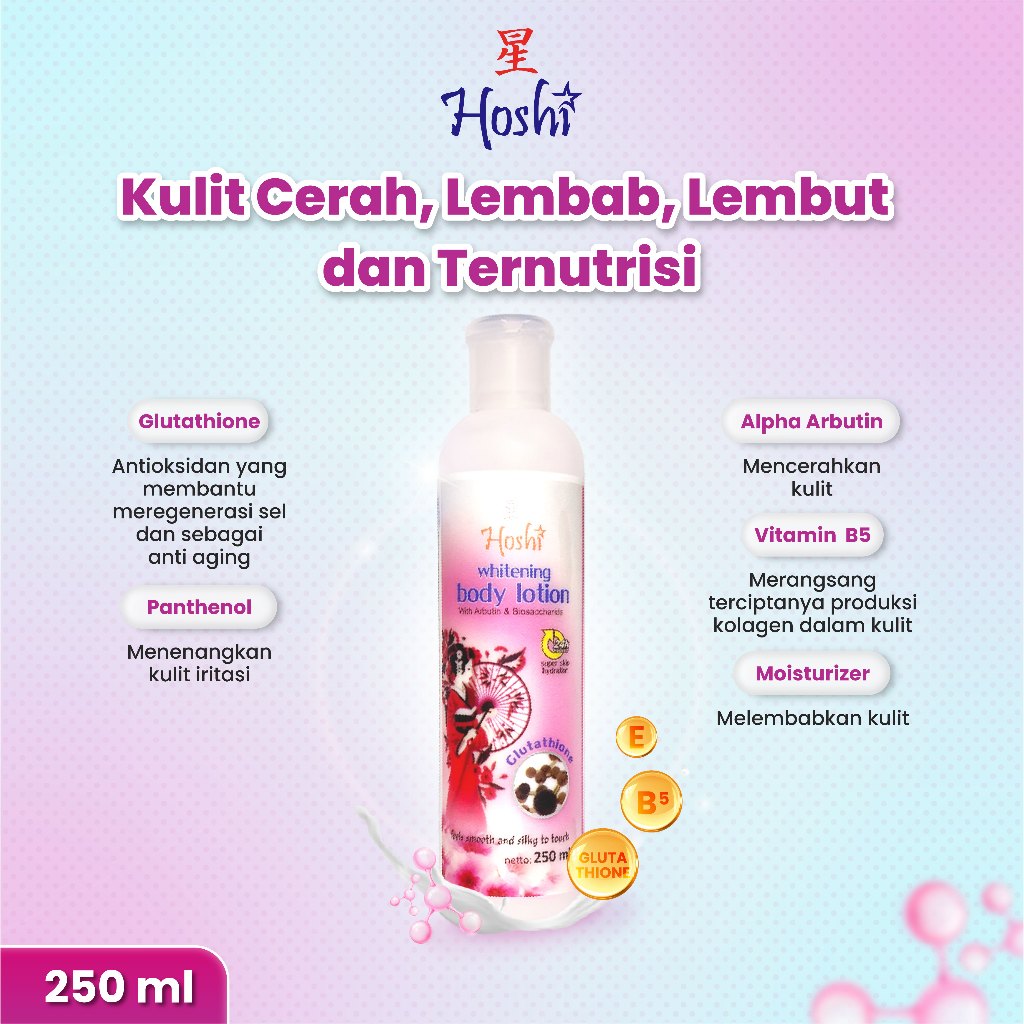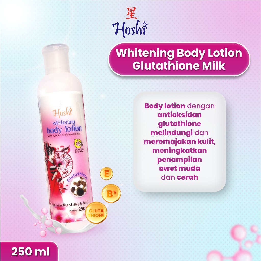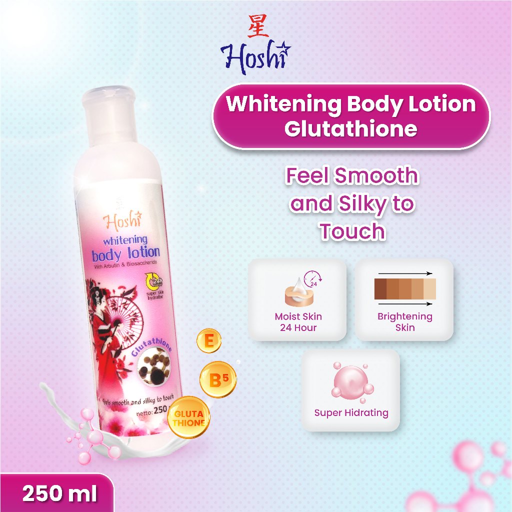 Hoshi Whitening Body Lotion mengandung Glutathione dan Alpha Arbutin sebagai pencerah, Biosaccharide sebagai moisturizer, dan vitamin B5 sebagai nutrisi ekstra bagi kulit. Lotion yang diformulasikan untuk membantu melembabkan, melembutkan, mencerahkan, dan merawat kulit secara menyeluruh.