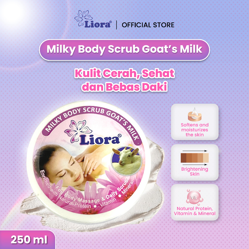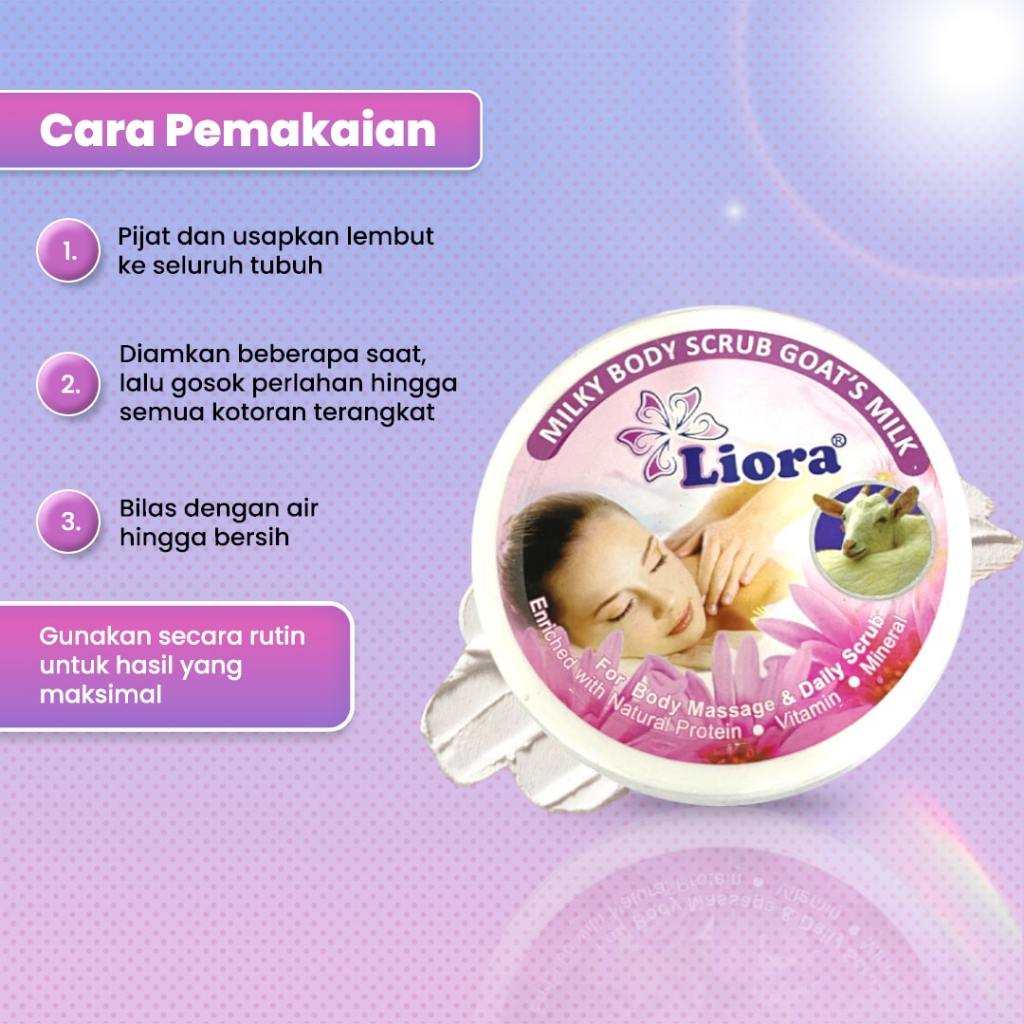 Liora Lulur Goat Milk merupakan produk perawatan kulit yang berfungsi sebagai lulur mandi sehari-hari. Mengandung natural protein, vitamin dan mineral yang dapat menutrisi kulit agar tetap sehat, halus dan bercahaya. Semua kotoran dikulit dapat cepat terangkat dan kulit terasa lebih bersih dan halus.