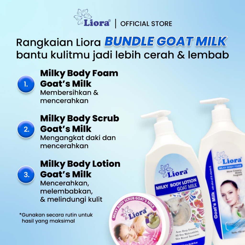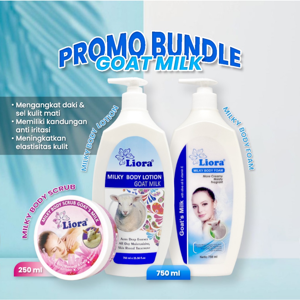 Paket Bundle Goat’s Milk yang berisi Liora Body Foam Goat’s Milk 750ML, Liora Body Lotion Goat’s Milk 750ML, dan Liora Body Scrub 250GR.